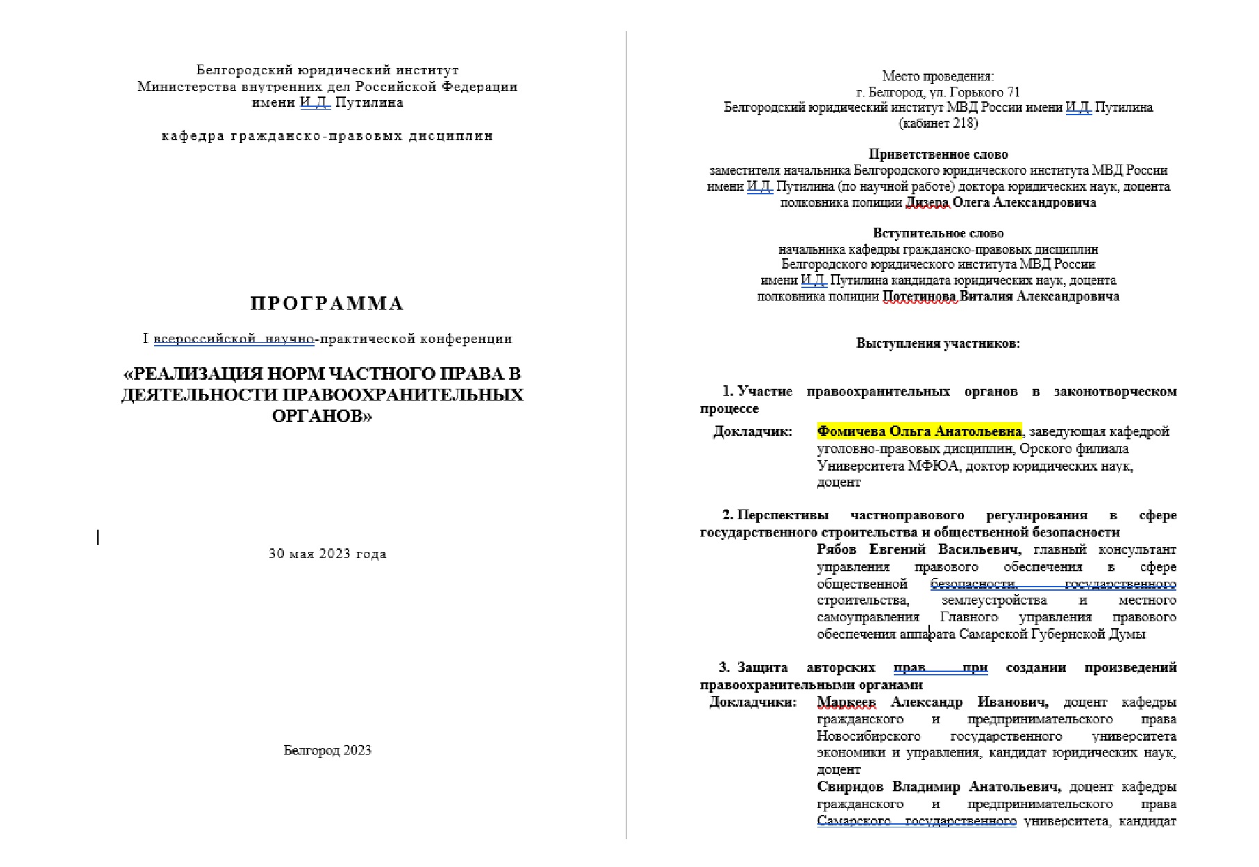 Профессор Орского филиала Фомичева Ольга Анатольевна приняла активное участие в работе научной конференции «РЕАЛИЗАЦИЯ НОРМ ЧАСТНОГО ПРАВА В ДЕЯТЕЛЬНОСТИ ПРАВООХРАНИТЕЛЬНЫХ ОРГАНОВ», прошедшей 30 мая 2023 г. на базе Белгородского юридического института Министерства внутренних дел РФ им. И. Д. Путилина