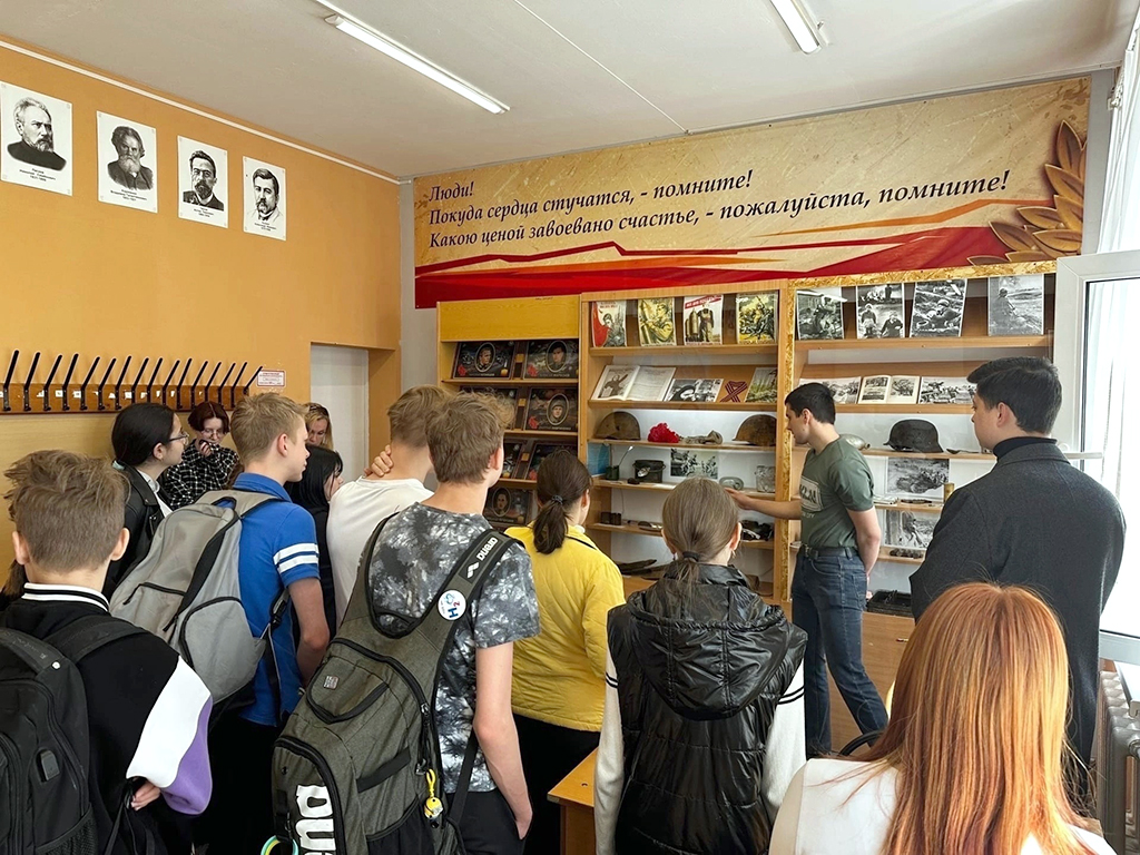 Просмотр экспозиций в Музее филиала, где находится военно-историческая экспозиция предметов Великой отечественной войны, поднятых студентами и выпускниками МФЮА на полях сражений Демянского района Новгородской области.